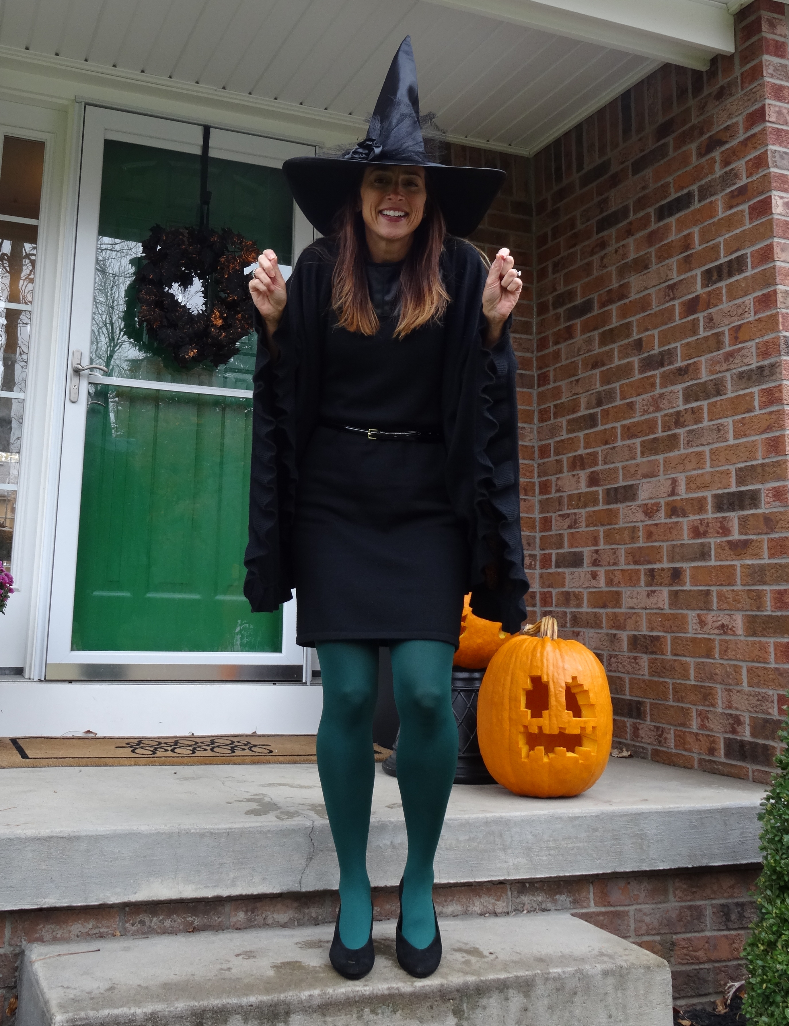 This was the easiest costume I’ve ever done. I was inspired by this post I found on Pinterest. Going to add her to my blog watch list for sure. Isn’t that cape cool? I could totally do that. Maybe next year. Back to the costume…I had everything but the hat ($3 from The Dollar Store). Everyone has a black dress of some kind, don’t they? I had two to choose from. I chose this sweater dress with leather detail (Chaps, Kohl’s, no longer available), black patent skinny belt (Target), black ruffle wrap (old), green tights (Merona, Target), black suede shoes (I got mine at DSW last year, but these are very similar). Done. So simple.
