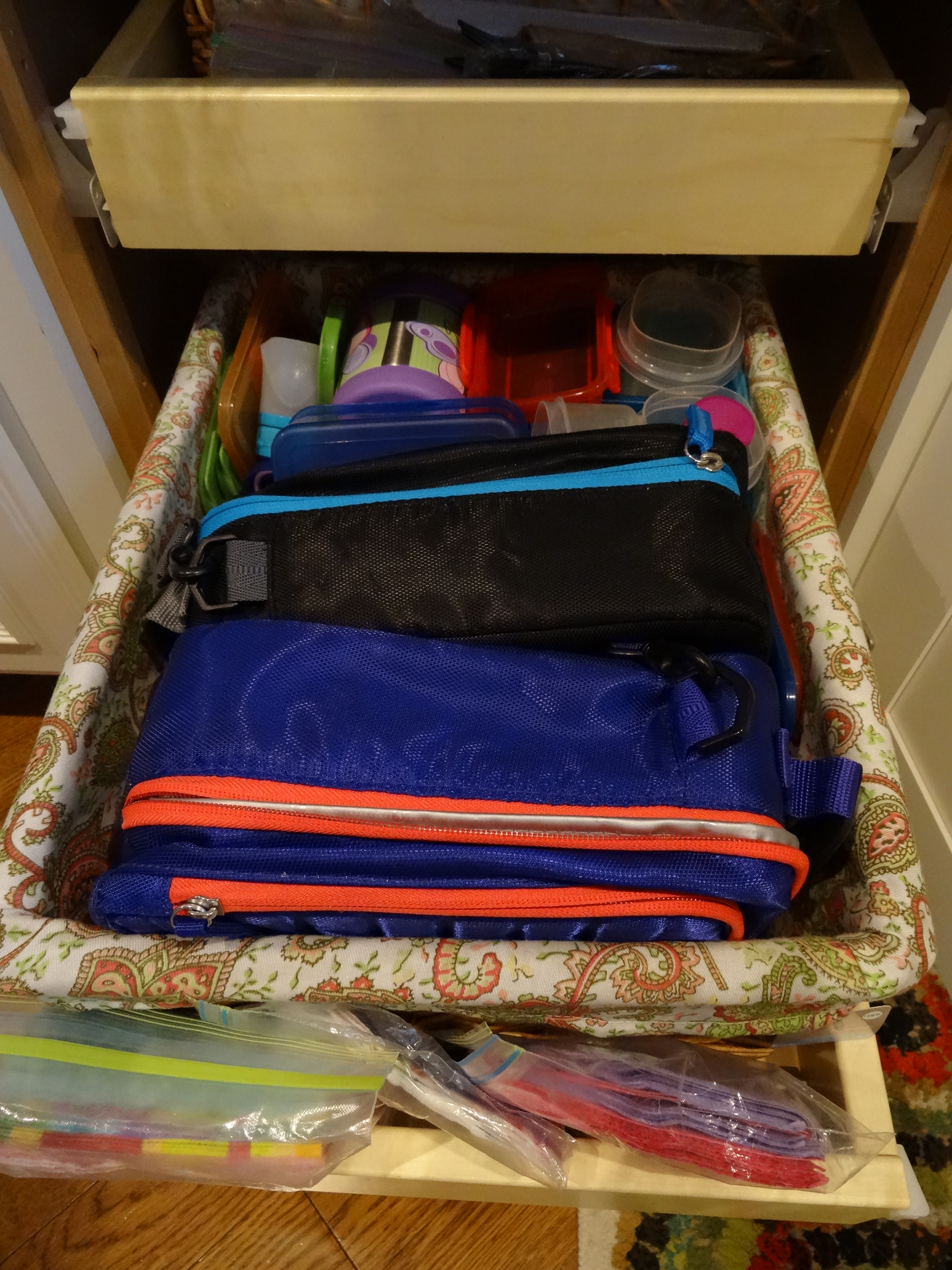 I did this 2 years ago and it works amazing. All of my lunch specific containers are in one pull out drawer. Snacks are organized in the pantry for easy grabbing in the morning. Top 2 pull outs are for snacks (mostly). When we redid our kitchen we put pull out shelves in every cupboard. I then decided that the best use of those shelves was to add appropriate sized baskets to contain whatever was going to go in there. I’ve got baskets for bread, plastic containers take up 2 shelves in my kitchen, kids drinkware, and the list goes on. It totally works! I didn’t have to do anything to these shelves before I took the pictures, so I’d say it’s been a success! A little tip, I use clothes pins to keep my snacks clipped, so I just keep them clipped to the basket so they are always there when I need one.