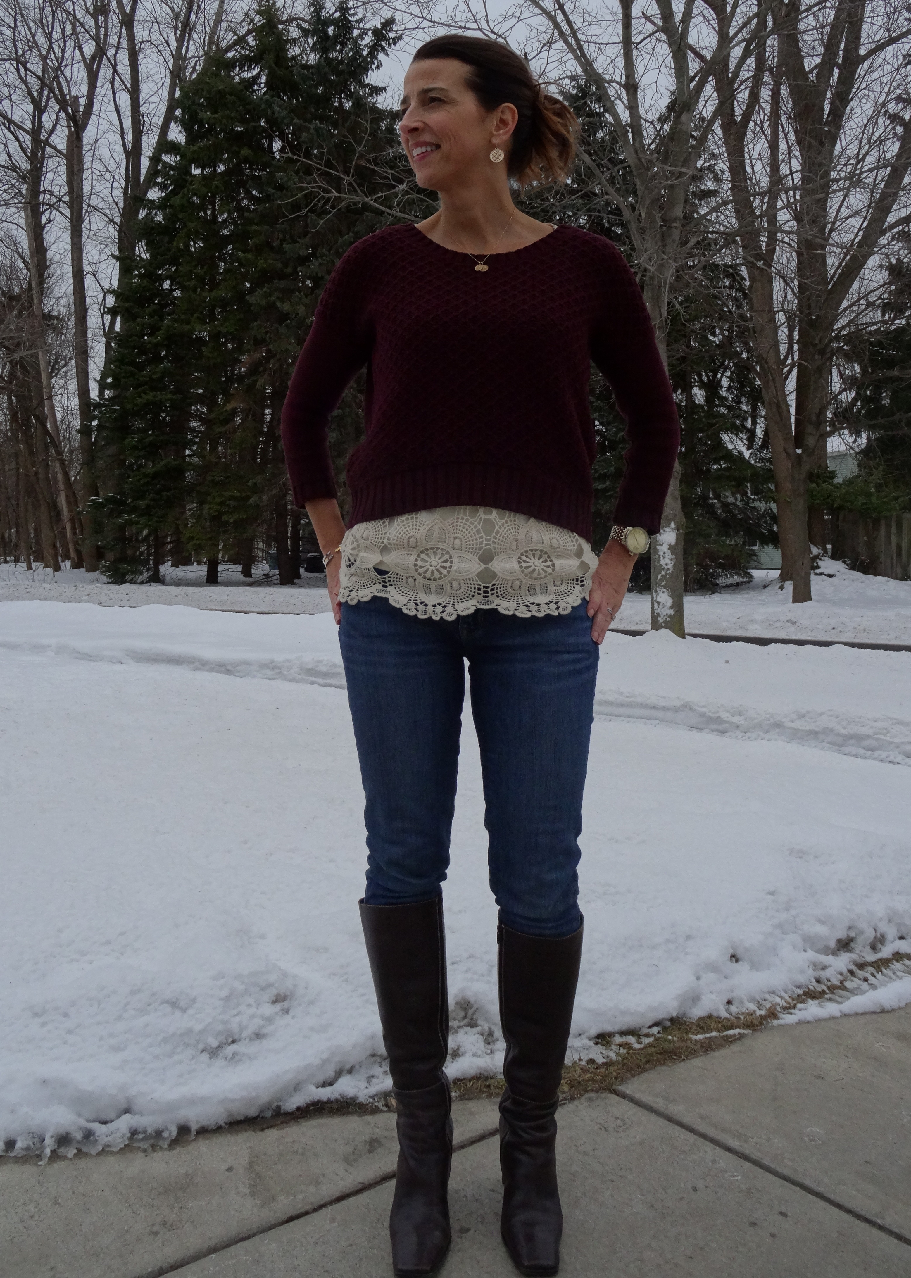 So this is spring? I’m sure many of my friends are dressing in adorable spring clothes. We in the northeast are still battling the chill (understatement). So today, a simple outfit. My standby combo of camo and stripes. Gap skinnies (seen here and here) are as neutral as blue jeans. My shirt is J.Crew (seen here) and the waffle knit wrap is an old target purchase that I haven’t worn in a while, but I saw this blogger wearing one similar and it inspired me to dig it out. Boots are Arturo Chang (seen here and here). Knit hat is the navy version of this one. I’m adding a little Navy to everything lately. Just love it! Coat is Nine West — Bought it at Tuesday Morning, of all places, or something like $25.00 2 years ago. My old olive coat was on it’s last legs when I ran across it. Fur collar is removable. These new sunglasses are quickly becoming a staple! And red lips… what do you think?