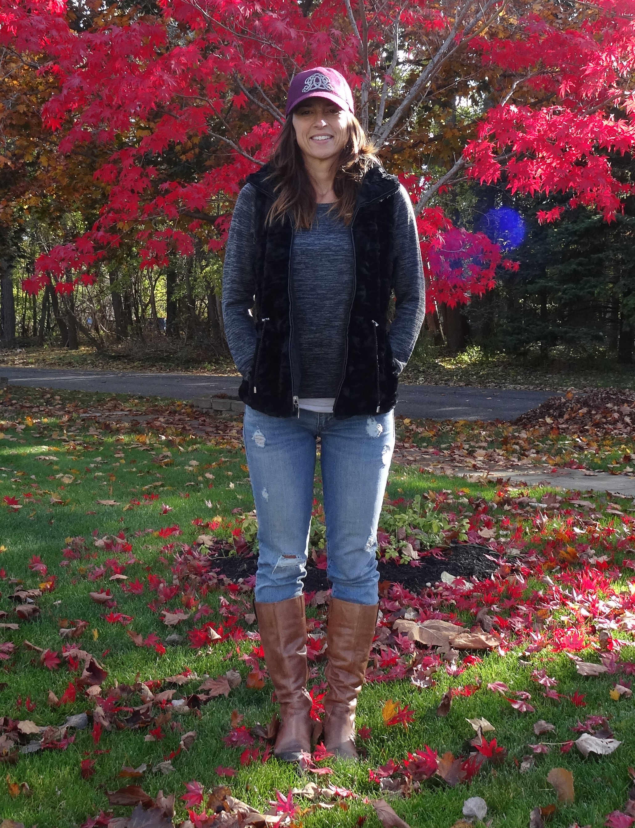 This was my school Holiday Party outfit. These coated leggings (also seen here) are so perfect for those days when the cookie tray got the best of you. 🙂 I folded the cuff under just once to make them just a tad shorter. What do you think of my new flats?? I love them–snake skin (OP Inspired) with a navy suede trim and honestly so comfortable. They are Sam Edelman (similar here). I know I will wear them with everything! The shirt was a JCPenney find, Joe Fresh (sad to say, I can’t find a link anywhere to buy). I like the color and the length. I’ve bought a few things in this merlot color so it will blend into my wardrobe nicely and the tunic length makes it so versatile; tie front, full tuck, half tuck, no tuck. They all work. The faux fur vest (also seen here) is from BJ’s, of all places, I bought it over a year ago, maybe 2. The necklace (looks like 3 but it’s all one) is also from Penny’s I got it for a steal at $7, regularly $24, back in October (along with this beauty for $3, reg. $30).