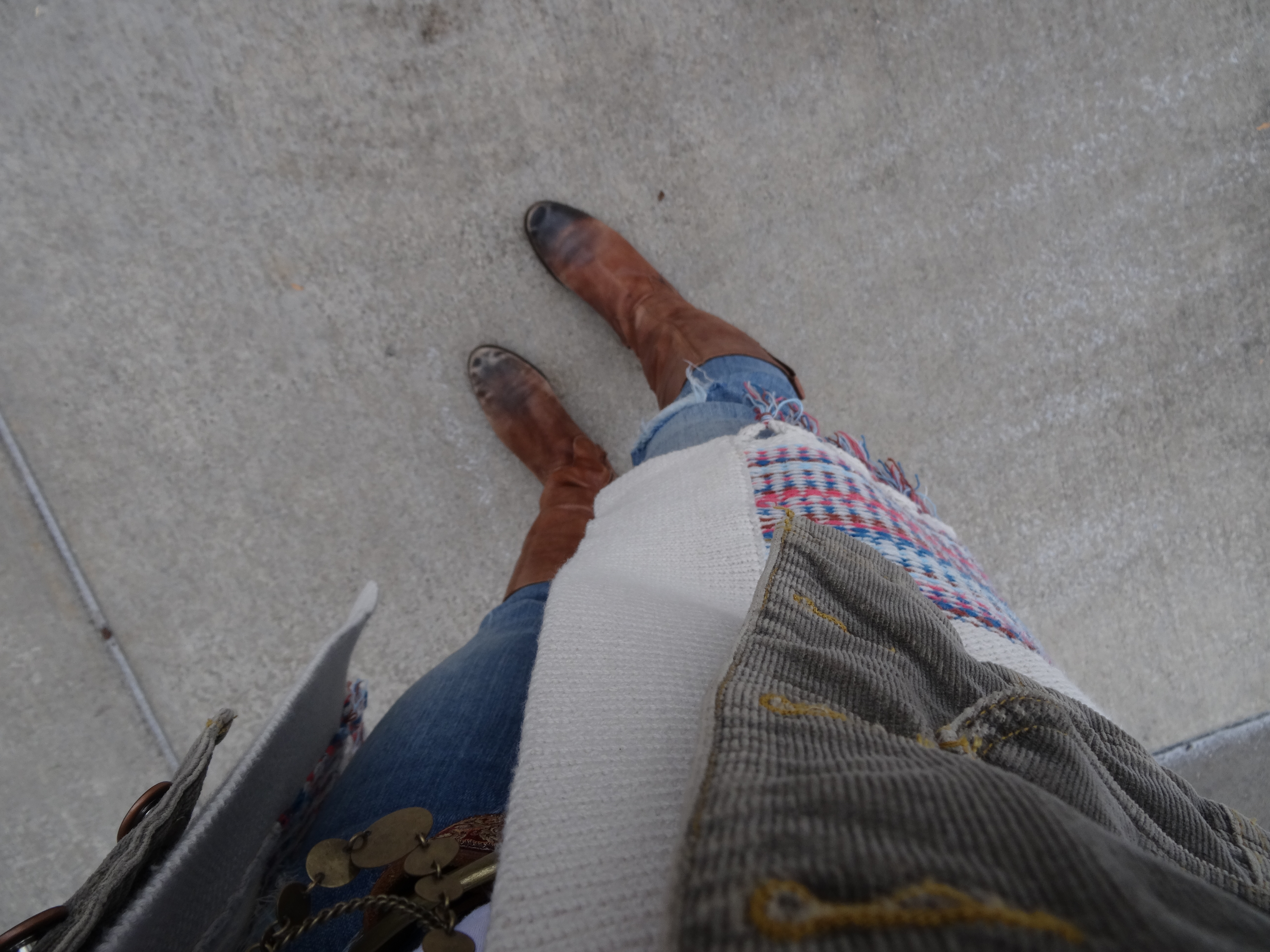 This has been one of my favorite outfits this spring. I bought the top at JC Penneys on clearance for $15.00. It’s made by Alyx and they call it a bubble top because it has a loose elastic bottom which makes it poof perfectly. The bell sleeves have lattice trim adding interest to an otherwise plain white top. This top will get me from spring and through summer easily. I see jean shorts and sandals. These jeans are GAP 1969 (also seen here and here) and quite old at this point — 3 years maybe (similar here). The boots are Ivanka Trump (also seen here) and I have worn the heck out of them, and love that they go all the way to my knees. The belt is the Thrift Store Find. I can’t remember how much it cost, but if it was more than $5 I would be very surprised. It is totally unique, which is why I browse thrift stores all the time. Sunglasses are RayBan 55 mm Aviators gold matte with brown lenses.