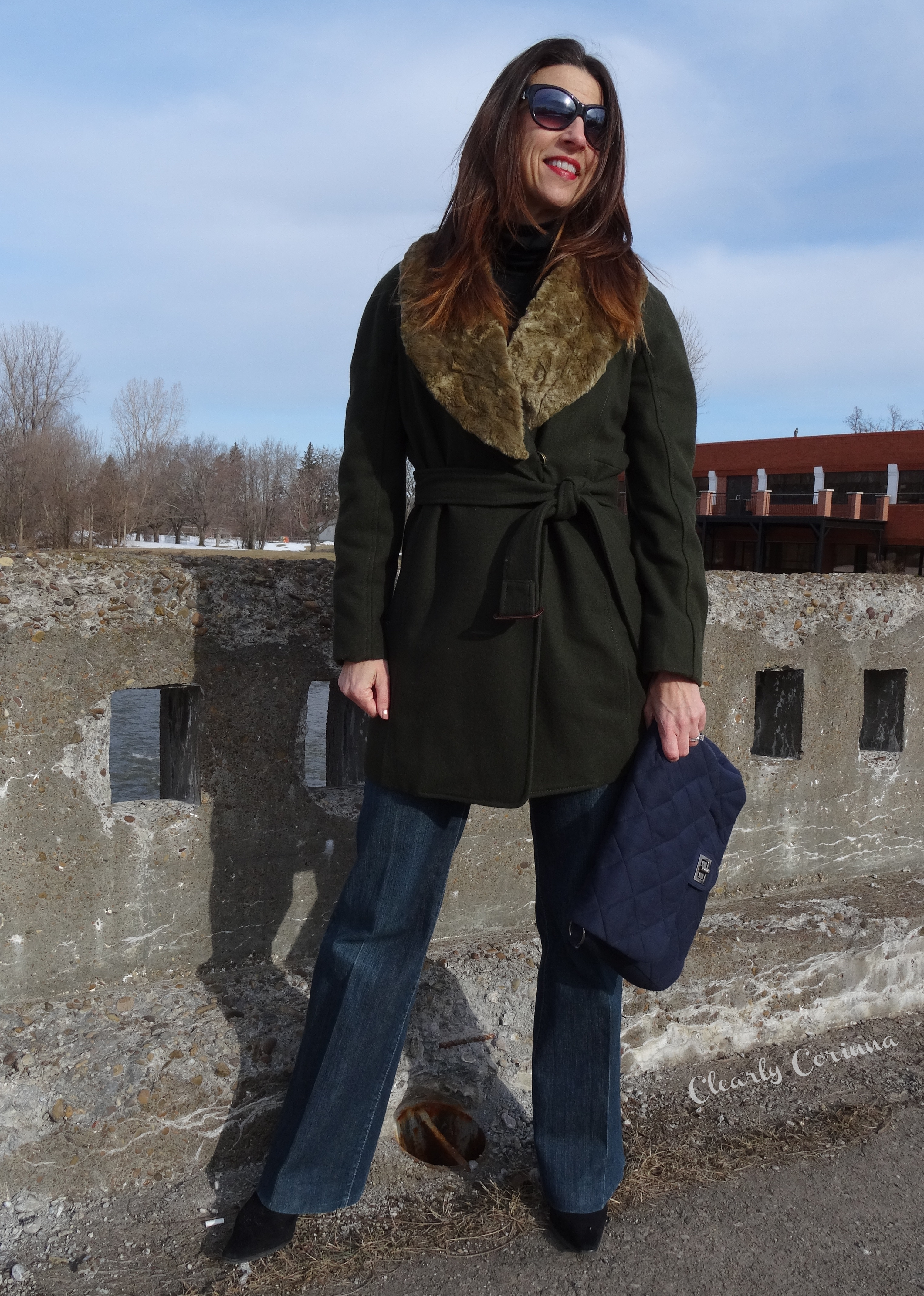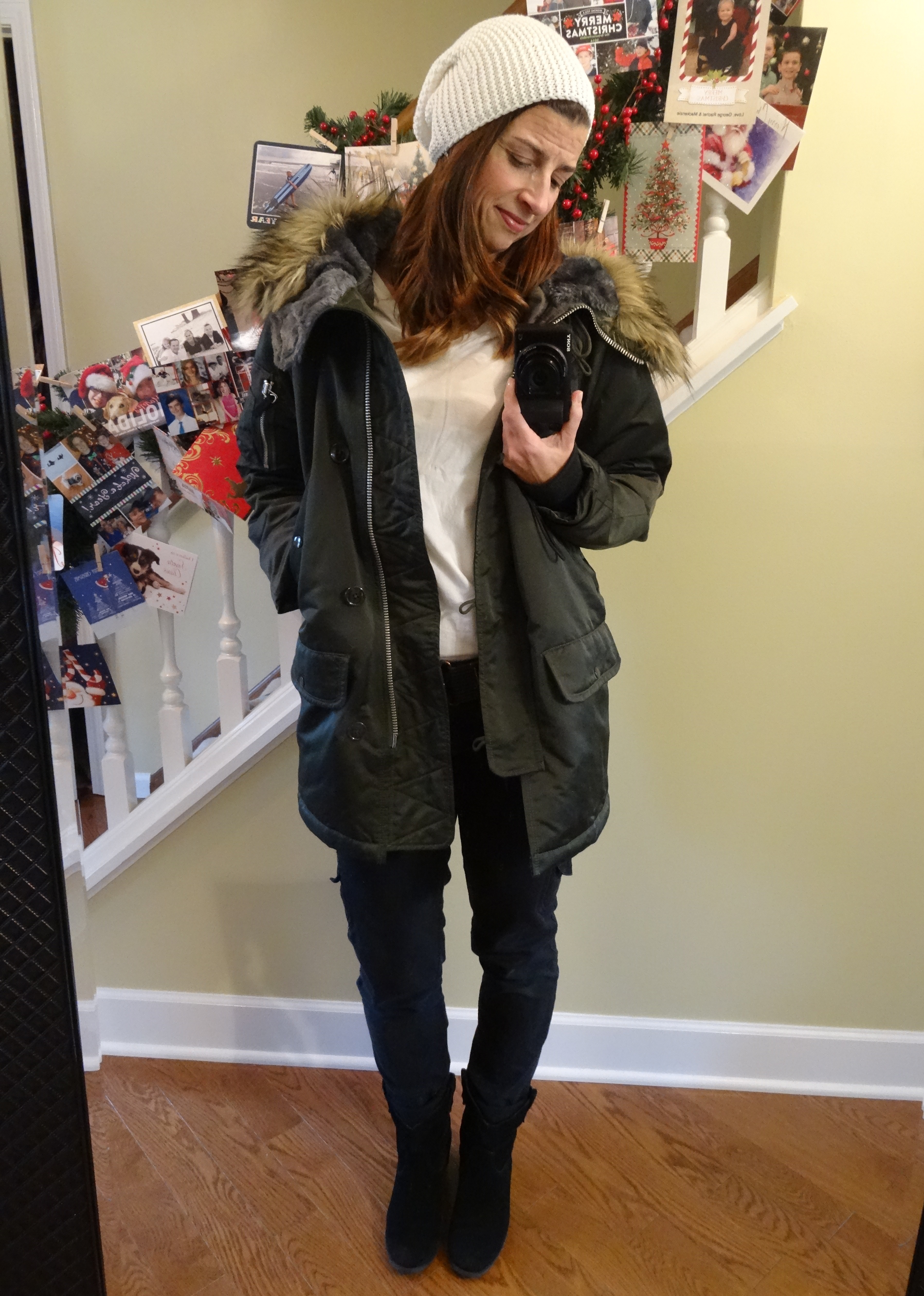 This was my school Holiday Party outfit. These coated leggings (also seen here) are so perfect for those days when the cookie tray got the best of you. 🙂 I folded the cuff under just once to make them just a tad shorter. What do you think of my new flats?? I love them–snake skin (OP Inspired) with a navy suede trim and honestly so comfortable. They are Sam Edelman (similar here). I know I will wear them with everything! The shirt was a JCPenney find, Joe Fresh (sad to say, I can’t find a link anywhere to buy). I like the color and the length. I’ve bought a few things in this merlot color so it will blend into my wardrobe nicely and the tunic length makes it so versatile; tie front, full tuck, half tuck, no tuck. They all work. The faux fur vest (also seen here) is from BJ’s, of all places, I bought it over a year ago, maybe 2. The necklace (looks like 3 but it’s all one) is also from Penny’s I got it for a steal at $7, regularly $24, back in October (along with this beauty for $3, reg. $30).