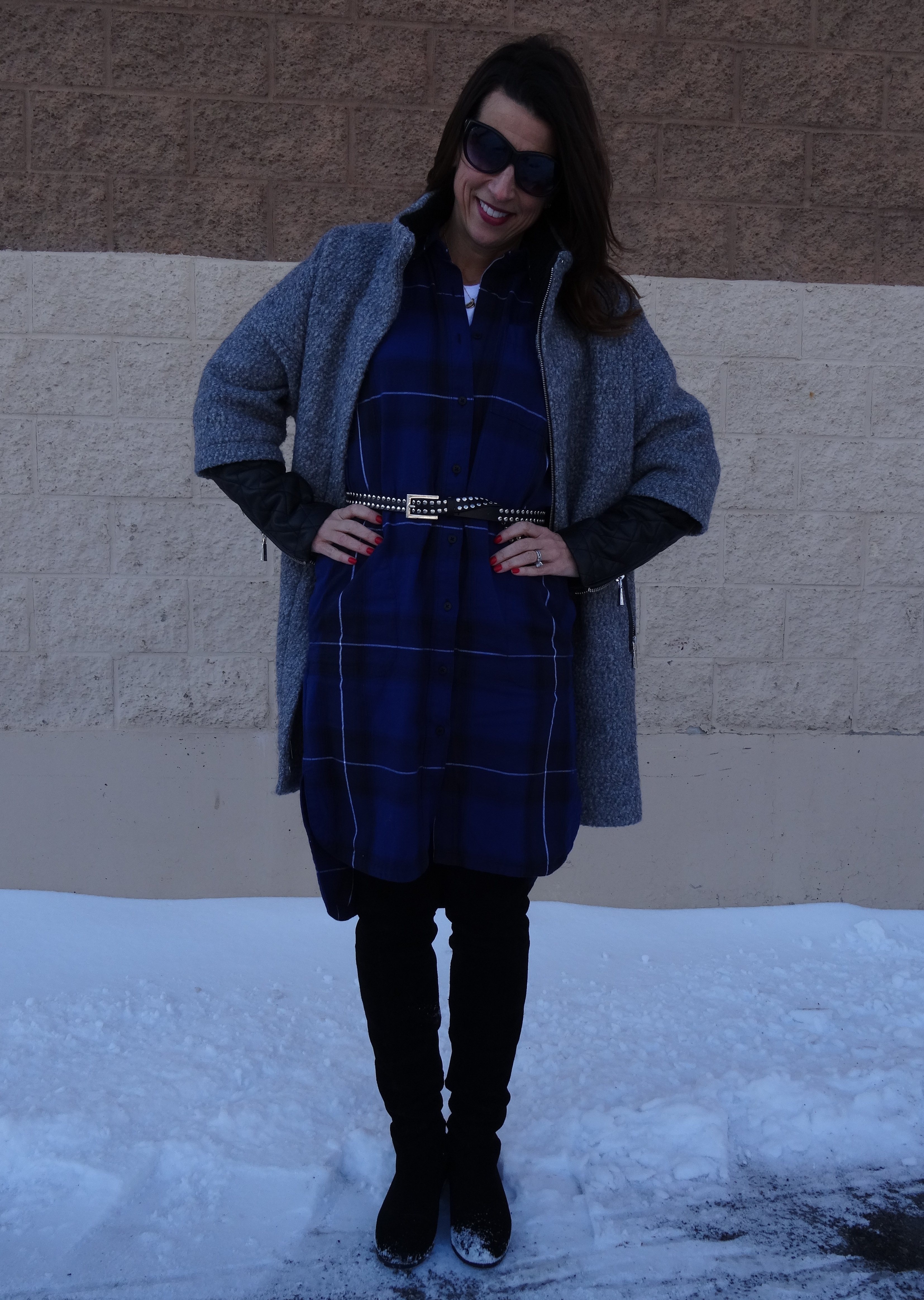 Accessories! Check out my new shades from Target. I love the thick bold tortoise shell frame. I’d bet they’ll be my go to this spring. My that girl (click here to read my That Girl story) earrings look kind of Gaelic, don’t they? Bag is Steve Madden and I bought it to imitate a Coach bag that I had to have but could never find. Belt is a skinny patent from Target.