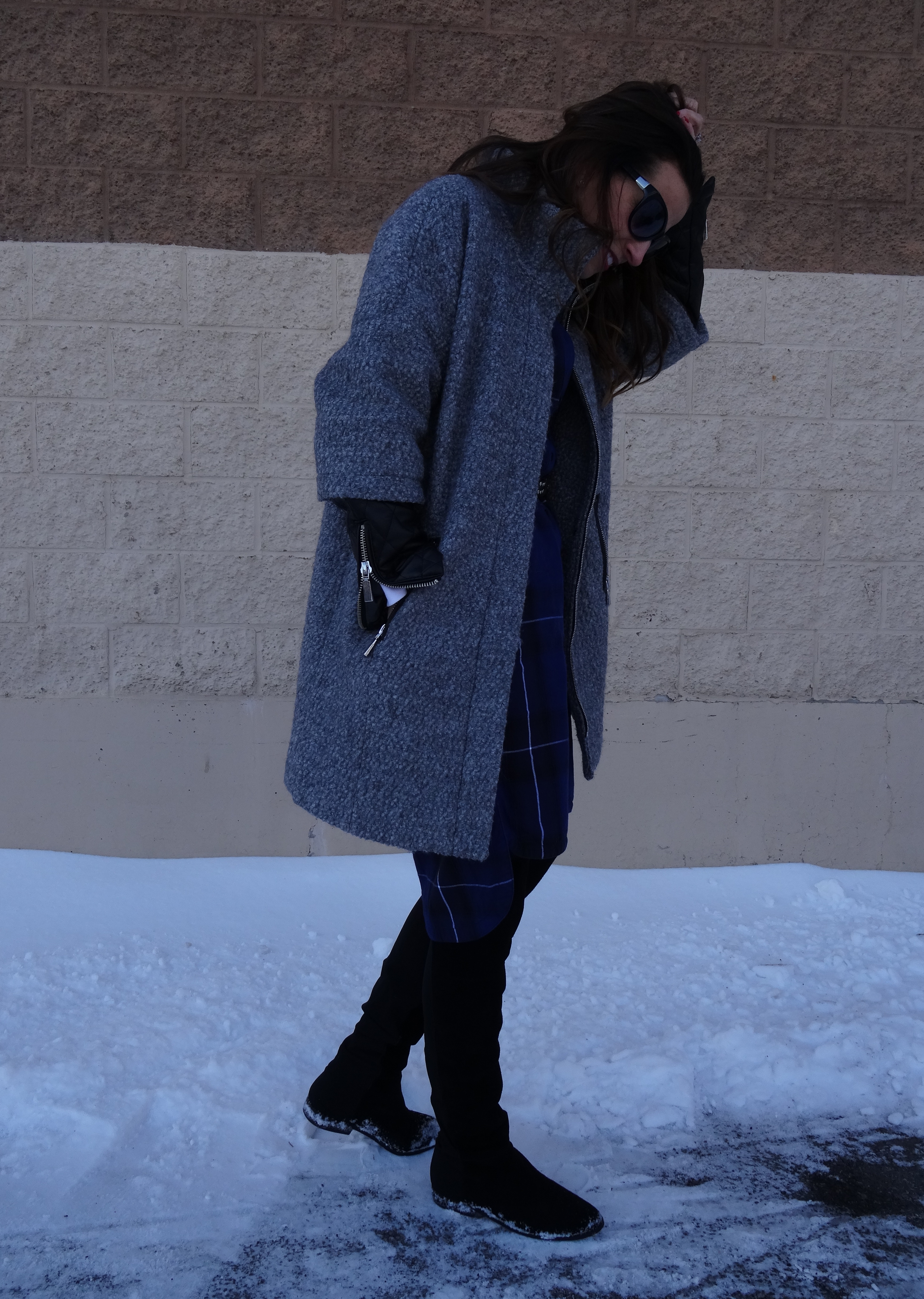 Skirt / Max Studio / Marshall’s, Turtleneck, Tights and Belt / Merona / Target, Boots / Riley over the knee suede / Chinese Laundry, Denim Jacket / H&M / Similar here, Scarf / ASOs Oversized Blanket Scarf / Similar here (color 1), Sunglasses / Target, Bag / Steve Madden Windsor Satchel / TJ Maxx