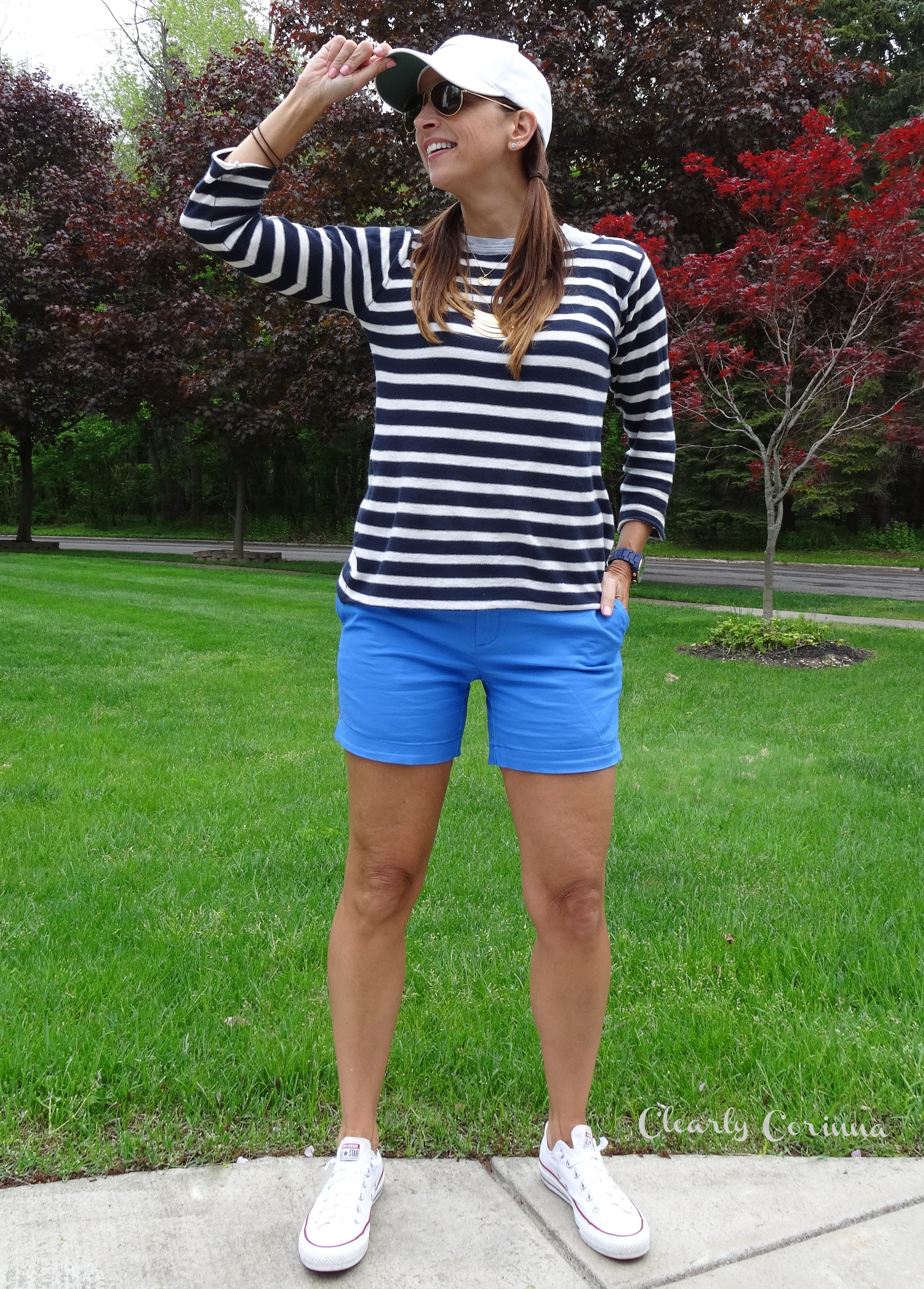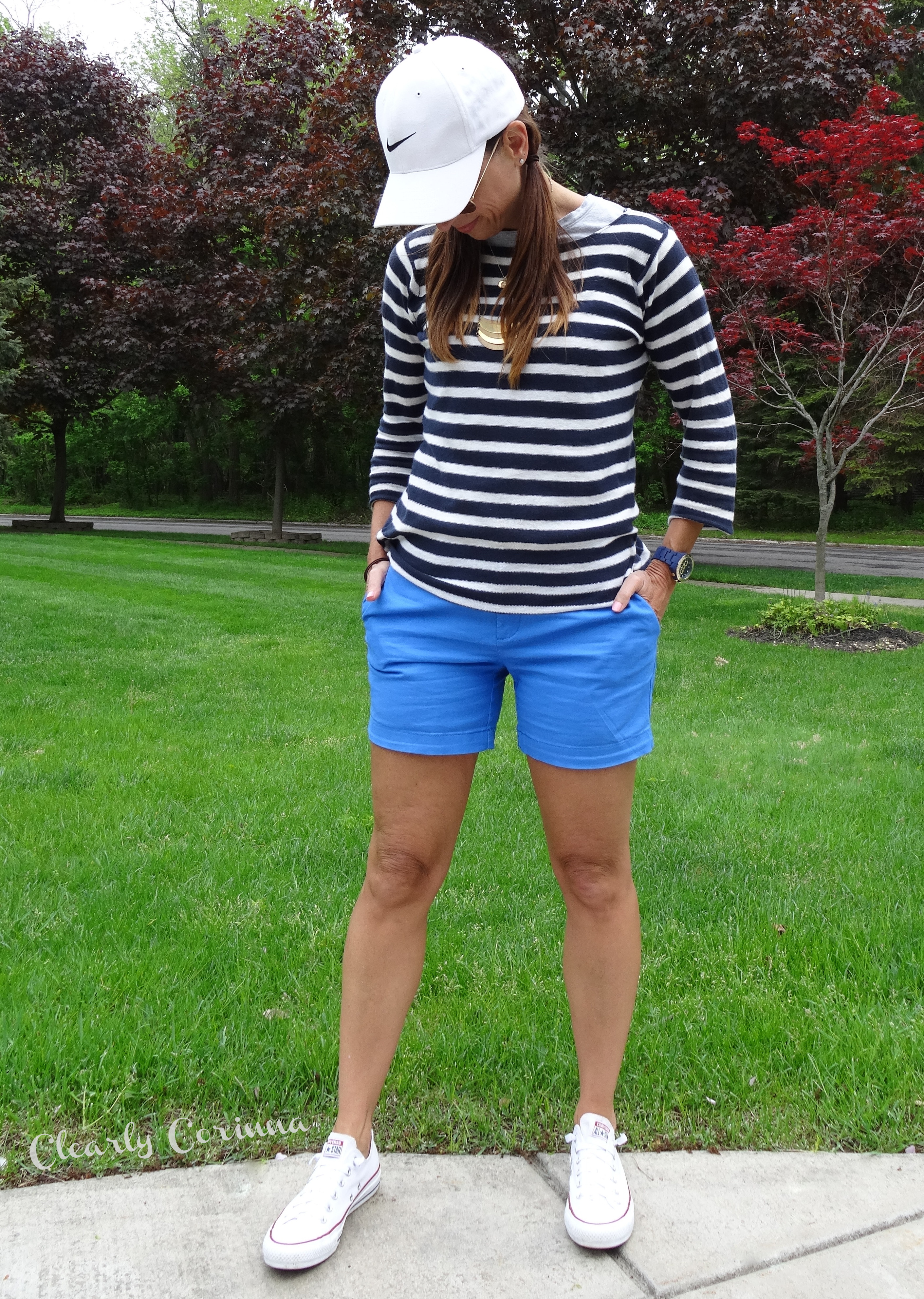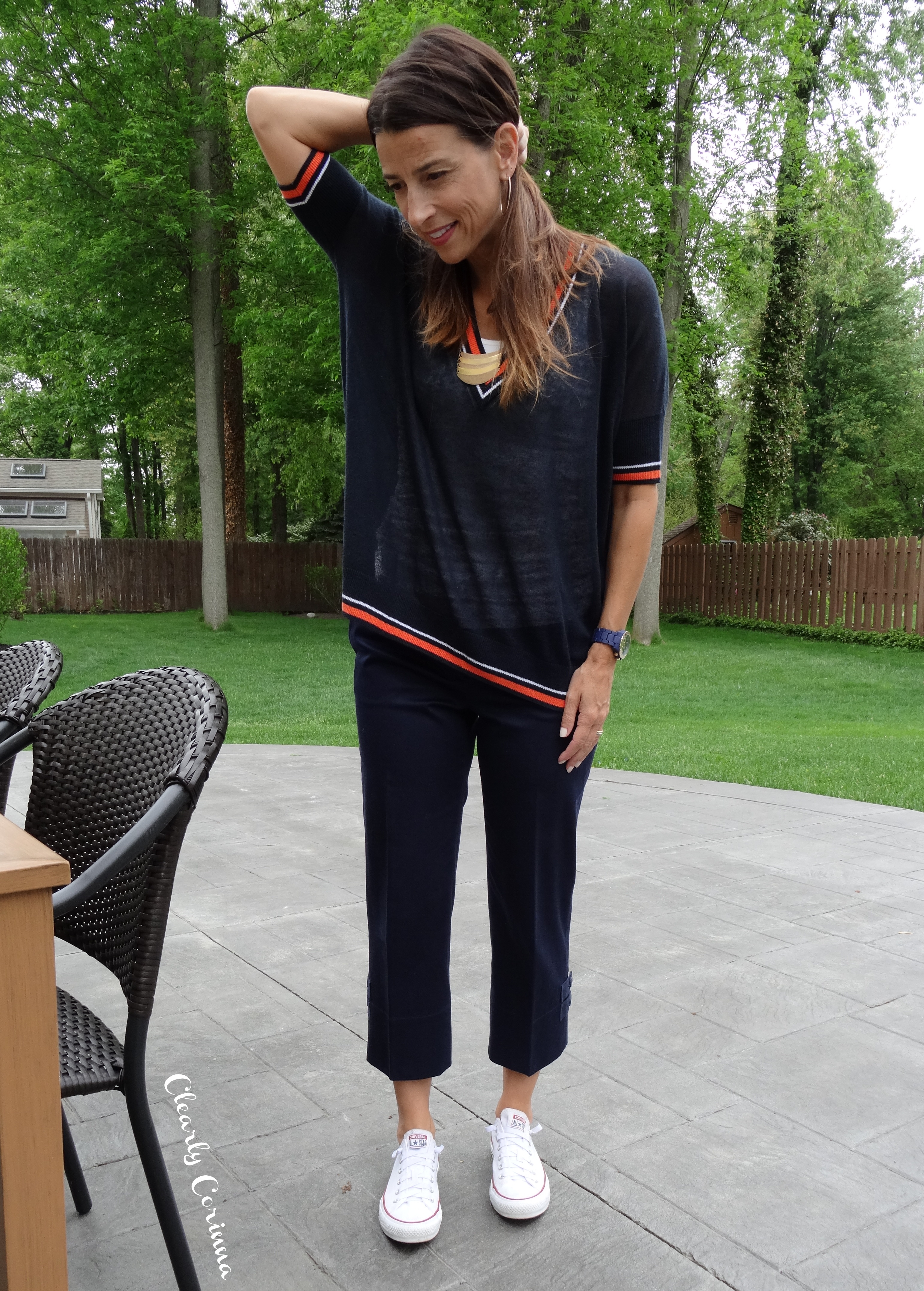 Navy Cropped pants, Navy Pants, Navy Sweater, Orange and white stripes, Orange and white trim, Tennis Sweater, White All Stars, White Converse